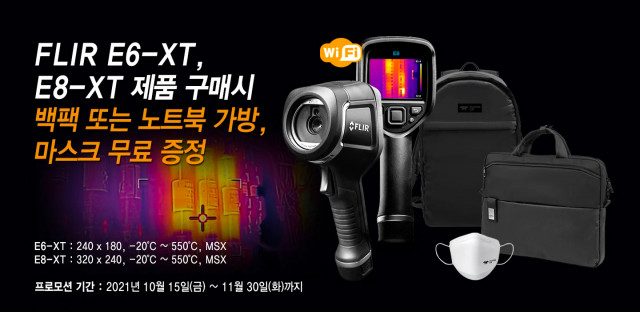 서울--(뉴스와이어) 2021년 10월 21일 -- 텔레다인 플리어(Teledyne FLIR, 한국지사장 이해동)가 FLIR E6-XT 및 E8-XT 열화상 카메라 제품을 구매하면 백팩 또는 노트북 가방, 그리고 마스크를 무료로 증정하는 사은품 증정 이벤트를 진행한다.