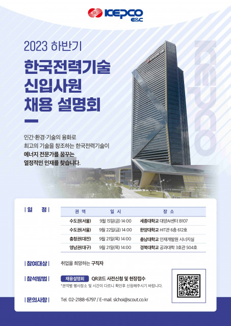 한국전력기술이 2023 하반기 채용을 앞두고 신입사원 채용 설명회를 개최한다고 15일 밝혔다.